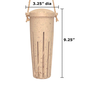 This unique Earthy Sustainable Peanut Bird Feeder is made with Coffee Husks. Dimensions are 9.25" high x 3.25" diameter. Globally abundant agricultural waste is being generated each day to fulfill the increasing demands of the fast-growing population. A lot of time energy and water goes into growing agricultural crops yet much of the resulting plant goes unwanted. The Earthy Sustainable range processes this agricultural waste blending it with resin. These products are frost proof and suitable for outdoor and indoor use. No animal-derived products used during the production of Earthy items making them vegan-friendly.