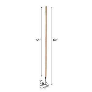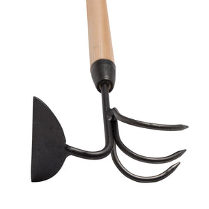 Dual-function head: One end features a 3-tine cultivator for loosening and aerating soil; the other end features a half-moon hoe for undercutting weeds and cutting roots.