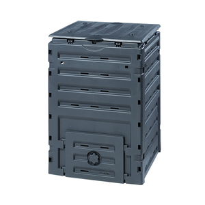 The Eco Master composter efficiently transforms kitchen scraps into valuable compost. It's eco-friendly, made entirely from recycled, UV-resistant polypropylene. Notable features include a single-piece feed opening lid with wind protection, and a large flap with a handle for easy compost removal. Its design ensures optimal ventilation and requires minimal space. The composter is simple to assemble without any tools and is manufactured in Germany. Dimensions: 25.6"L x 23.6"W x 35.5"H, with a capacity of 79 gallons.