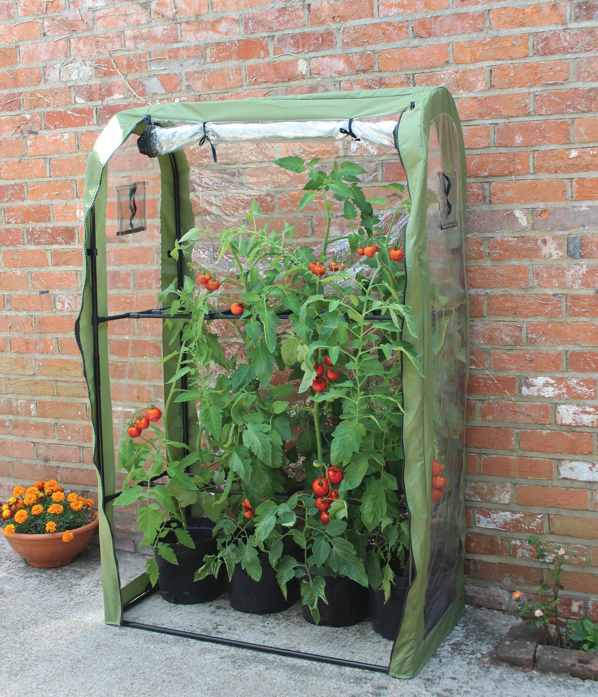 - Front rolls up for easy plant handling; end vents have insect netting for airflow.