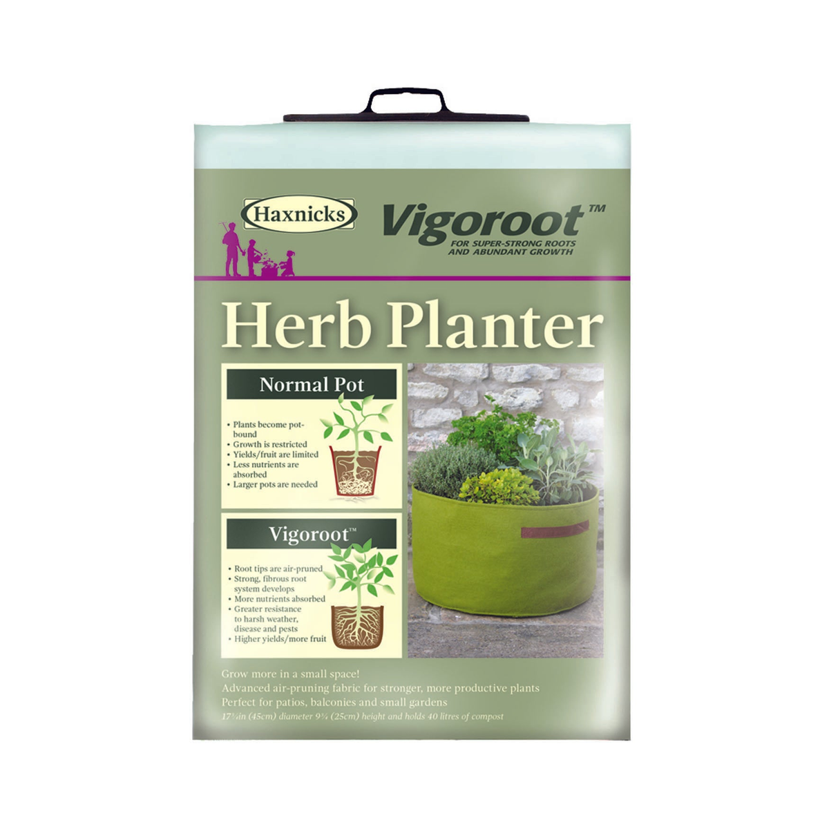 This Herb Planter is far from ordinary! Its "Vigoroot" fabric employs air-pruning to significantly alter root formation, enhancing the plant's ability to thrive in a modest volume of compost. This promotes a more robust root system, which allows the plant to uptake more nutrients. The Vigoroot fabric prevents excessive root growth and stops them from becoming pot-bound. A stronger root system renders the plants more resilient to severe weather, pests, and diseases. It includes convenient handles for easy transportation, detailed instructions, a growing guide, and helpful tips. The planter can hold up to 10.6 gallons of growing medium. Since 1994, Haxnicks has been creating and producing innovative garden care and plant protection products for their customers in England. Product dimensions: 17.7"D x 9.7"H, 10.6 gallons. Pack size: 1.