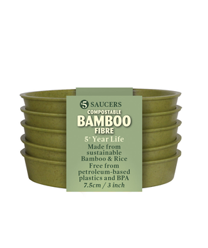 Discover our 5-pack of 4" green bamboo saucers, crafted from bamboo fiber and rice starch. These eco-friendly saucers are devoid of petroleum-based plastics and BPA, ensuring a sustainable choice. Durable for over 5 years, whether used indoors or outdoors, they offer an excellent alternative to single-use options. Additionally, they are biodegradable, decomposing within 6–12 months. Ideal for pairing with our #50-1452 5-pack 4" bamboo pots! Dimensions: 3"W x 0.9"H; Weight: 0.7lbs; Pack Size: 5.