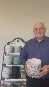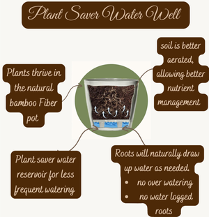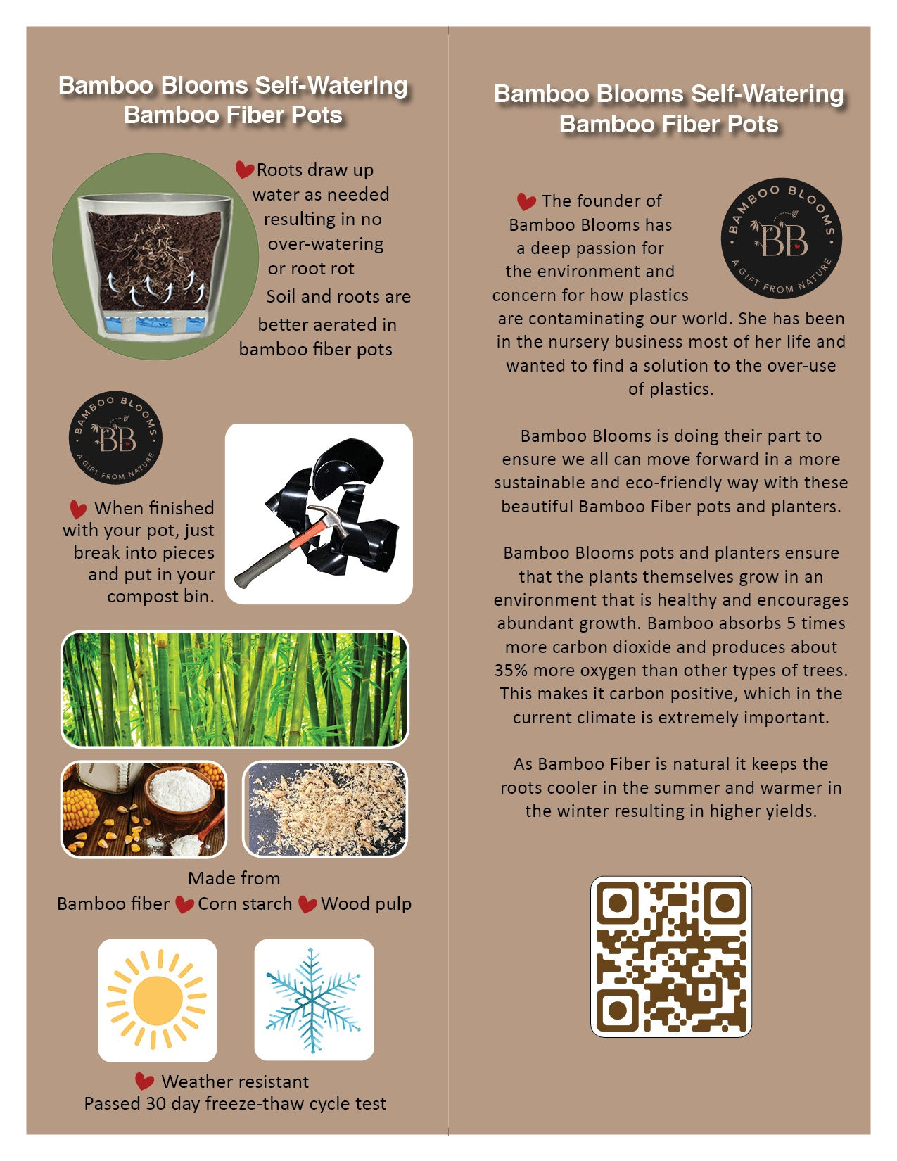 Discover the world's first Self-Watering Pot made from eco-friendly bamboo fiber. This contemporary 7" round pot, blending natural bamboo fiber with corn starch and wood pulp, is fully biodegradable and plastic-free. Bamboo Blooms innovative design promotes robust plant growth, thanks to a unique water well at the base that hydrates and aerates the roots. Ideal for any climate, indoors or outdoors, it simplifies plant care by using capillary action to wick moisture up as needed, preventing overwatering and ensuring strong, healthy plants. Simply maintain the water level in the well, and even those without a natural "green thumb" can enjoy thriving greenery.