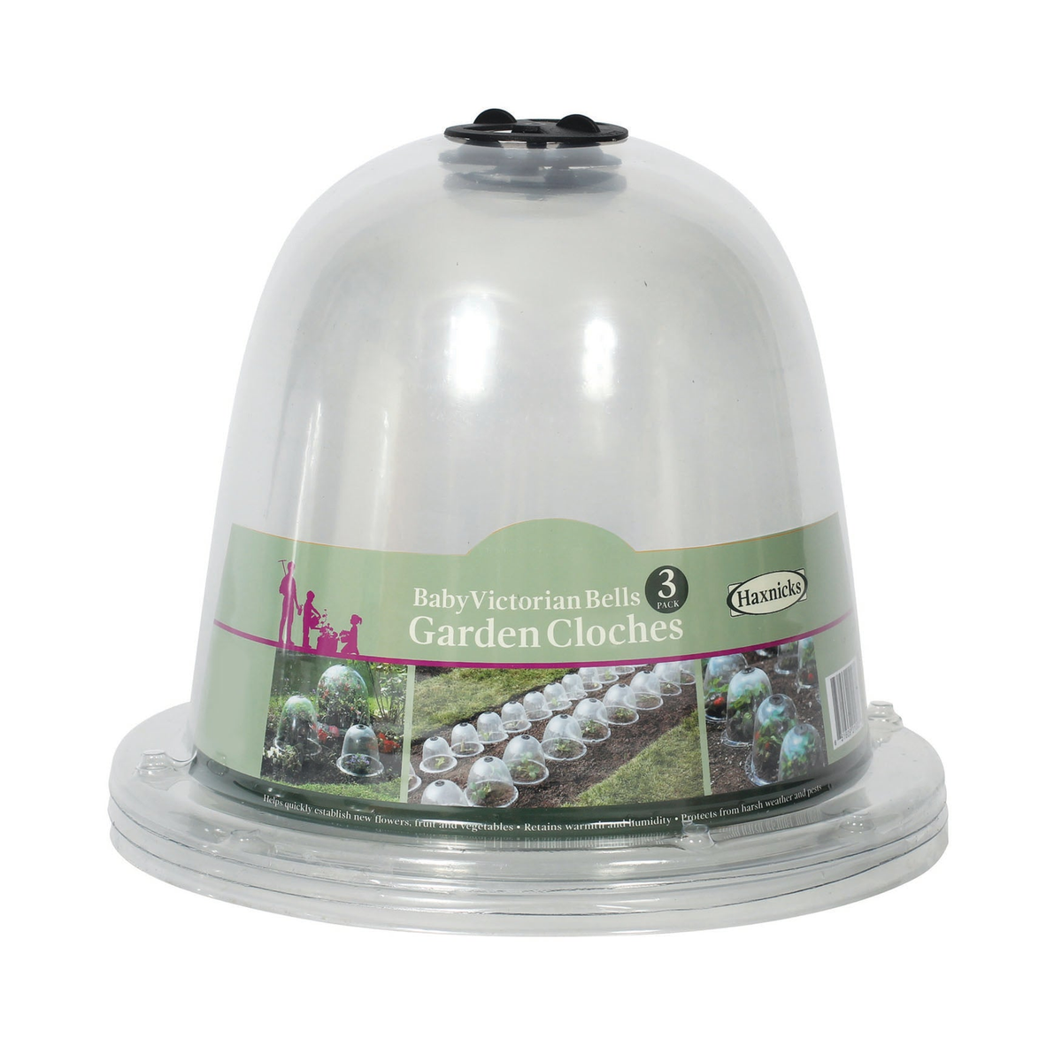 Baby Victorian Bells are ideal for protecting young plants & seedlings and establishing early salad crops, promoting quick, stable, and strong growth. It is ideal for a range of plants, such as herbs, flowers, and vegetables. The dome-shaped cloche allows for maximum light penetration and minimal reflection, fostering perfect growing conditions. It preserves warmth, directs rainwater and moisture to the soil, and provides defense against harsh weather, pests, birds, and animals. The adjustable air vents offer control over the temperature, humidity, and airflow. Haxnicks has been creating innovative solutions for garden care and plant protection for their customers in England since 1994. The product's dimensions are 9.6 inches in diameter and 7.9 inches in height, with a weight of .5 pound, available in a set of three.