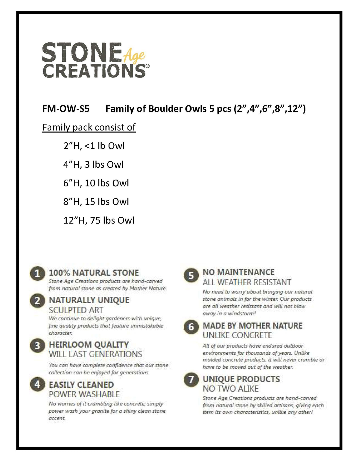 - The set features five owls in different sizes: 2" (.5-1lb), 4" (3lb), 6" (10lb), 8" (15lb), and 12" (50lb).