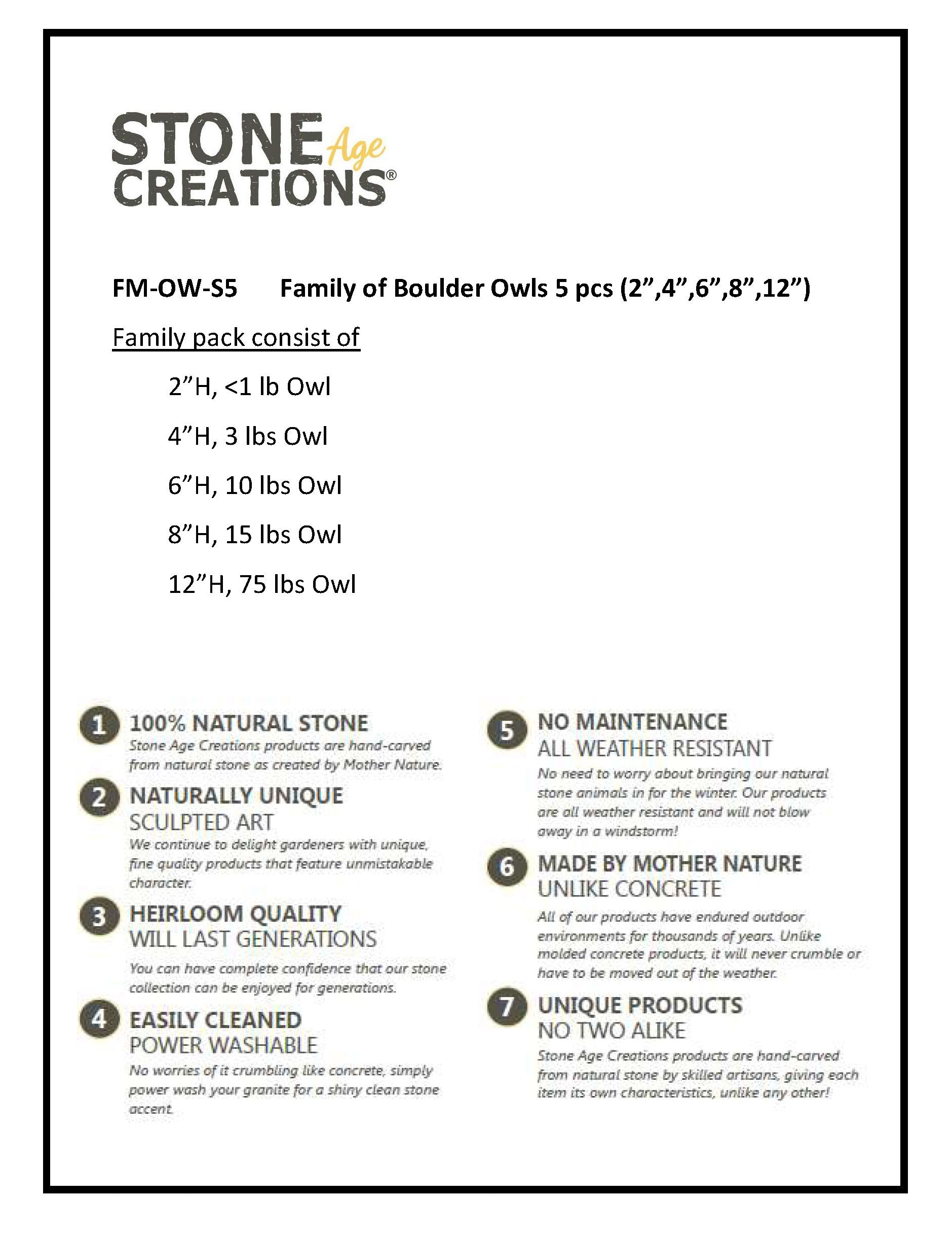 Enhance your garden or home with this charming Family of Boulder Owls, perfect for gifting as well. Crafted from natural granite boulders, each owl features hand-carved details and a smooth finish, making every piece unique in shape and color. The set includes five owls of varying sizes and weights, approximately 2" (.5-1lb), 4" (3lb), 6" (10lb), 8" (15lb), and 12" (50lb). As part of the Stone Animal Collection, these boulder owls offer a sturdy and eco-friendly alternative to conventional concrete garden decor, highlighting the natural beauty and unique traits of the stone.