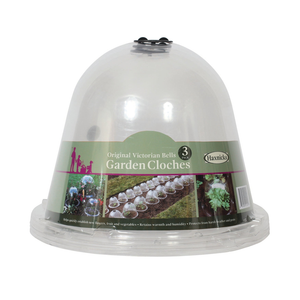 The Haxnicks Original Victorian Bell Cloche is crafted to protect early crops and young plants, promoting quick, stable, and strong growth. It is ideal for a range of plants, such as herbs, flowers, and vegetables. The dome-shaped cloche allows for maximum light penetration and minimal reflection, fostering perfect growing conditions. It preserves warmth, directs rainwater and moisture to the soil, and provides defense against harsh weather, pests, birds, and animals. The adjustable air vents offer control over the temperature, humidity, and airflow. Haxnicks has been creating innovative solutions for garden care and plant protection for their customers in England since 1994. The product's dimensions are 13.5 inches in diameter and 10 inches in height, with a weight of 1 pound, available in a set of three.