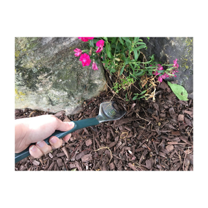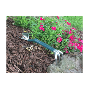 Henfeather's The Trake garden tool stands out with its sleek, elegant, and uniquely shaped design, earning high acclaim. This ultimate gardening tool combines a trowel and rake, featuring a long 17-inch handle for comfortable use while kneeling or sitting, reducing back strain. The trowel blade includes permanent graduations for precise bulb and seed planting. Its angled handle aids in efficient digging and cultivating, with the rake end designed to reach narrow spaces. The terradynamic trowel easily penetrates soil, complemented by a non-slip vinyl-coated shaft. Made from solid die-cast alloy, it resists rust, bending, and distortion. Dimensions: Head - 6"L x 2.5"W, Total - 17"L, Weight - 1lb.